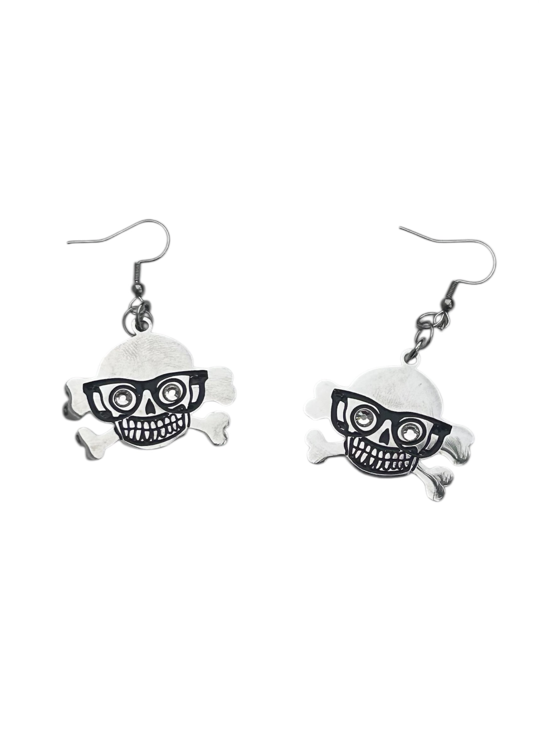 Set of 2 approximately 1" stainless steel earrings with 2D skull nerd design and decorative rhinestones on each one!
